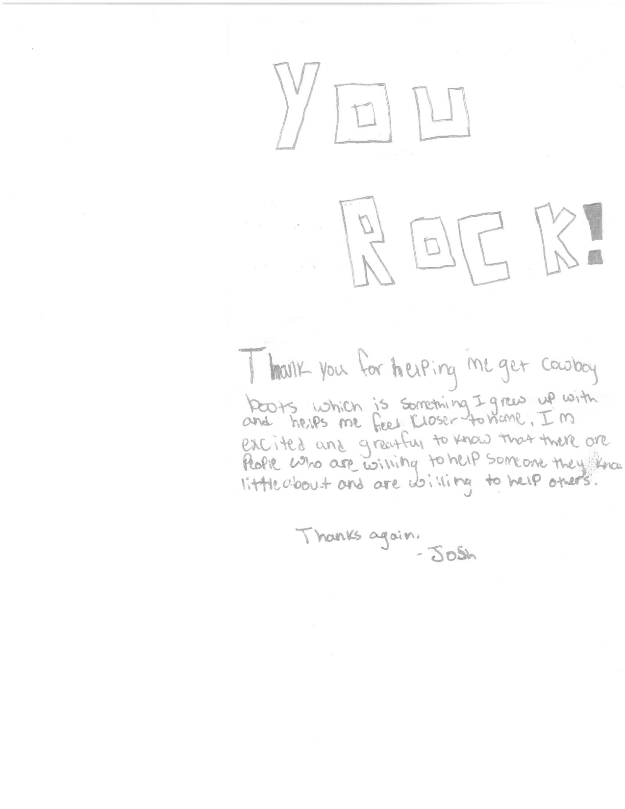 "Dear Josh, We hope these boots help you feel at home. Wishing you all the best. Sincerely, Meg and Yoni "
